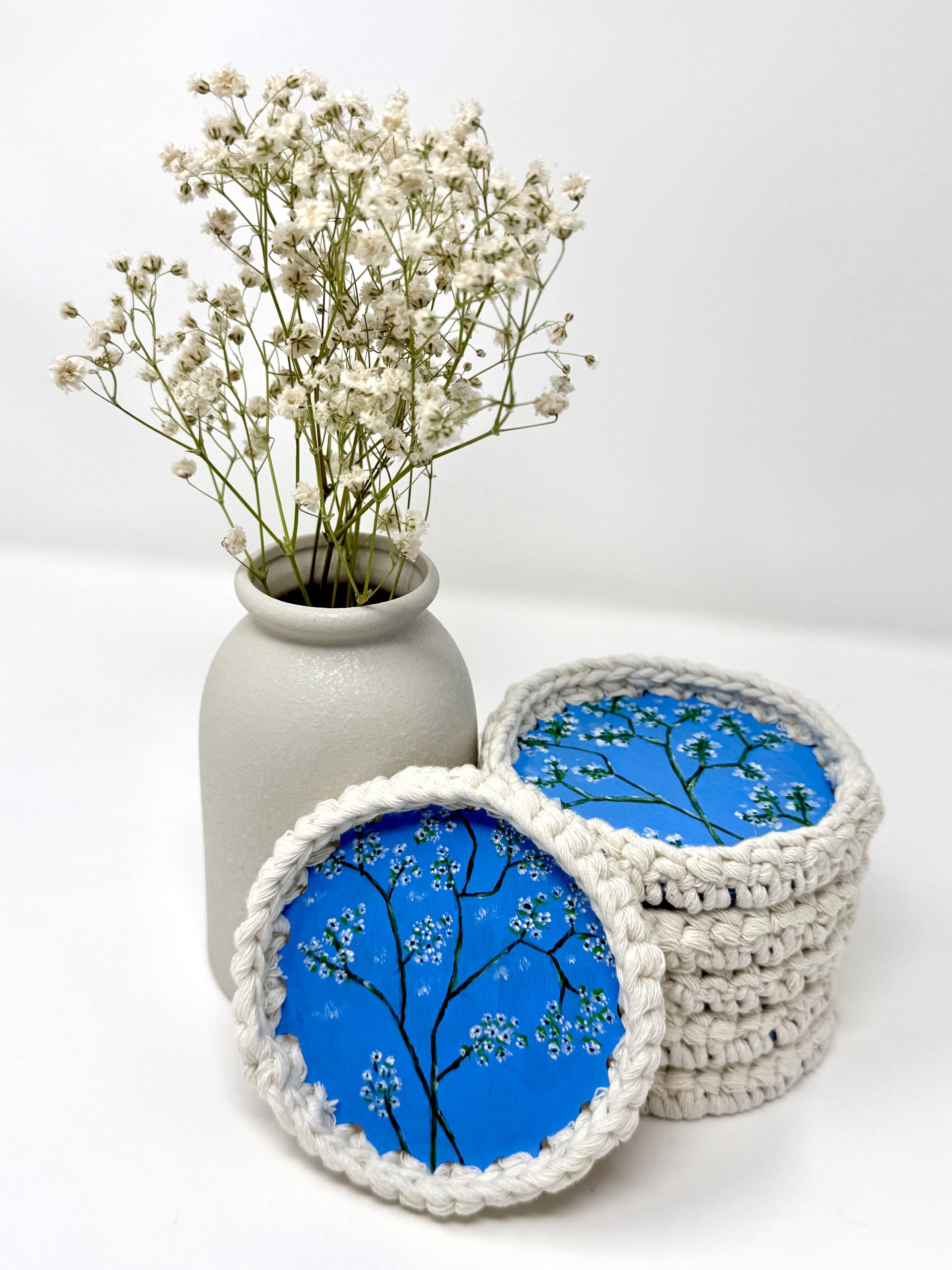 Bring elegance and artistry to your table with this set of 6 handcrafted coasters. Each piece features a sturdy wooden base hand-painted with delicate baby’s breath flowers, beautifully detailed against a vibrant blue background. The edges are carefully finished with a macramé crochet trim, adding a touch of softness and charm while protecting surfaces from scratches. Perfect for everyday use or special gatherings, these coasters combine practicality, durability, and handmade beauty in one set.