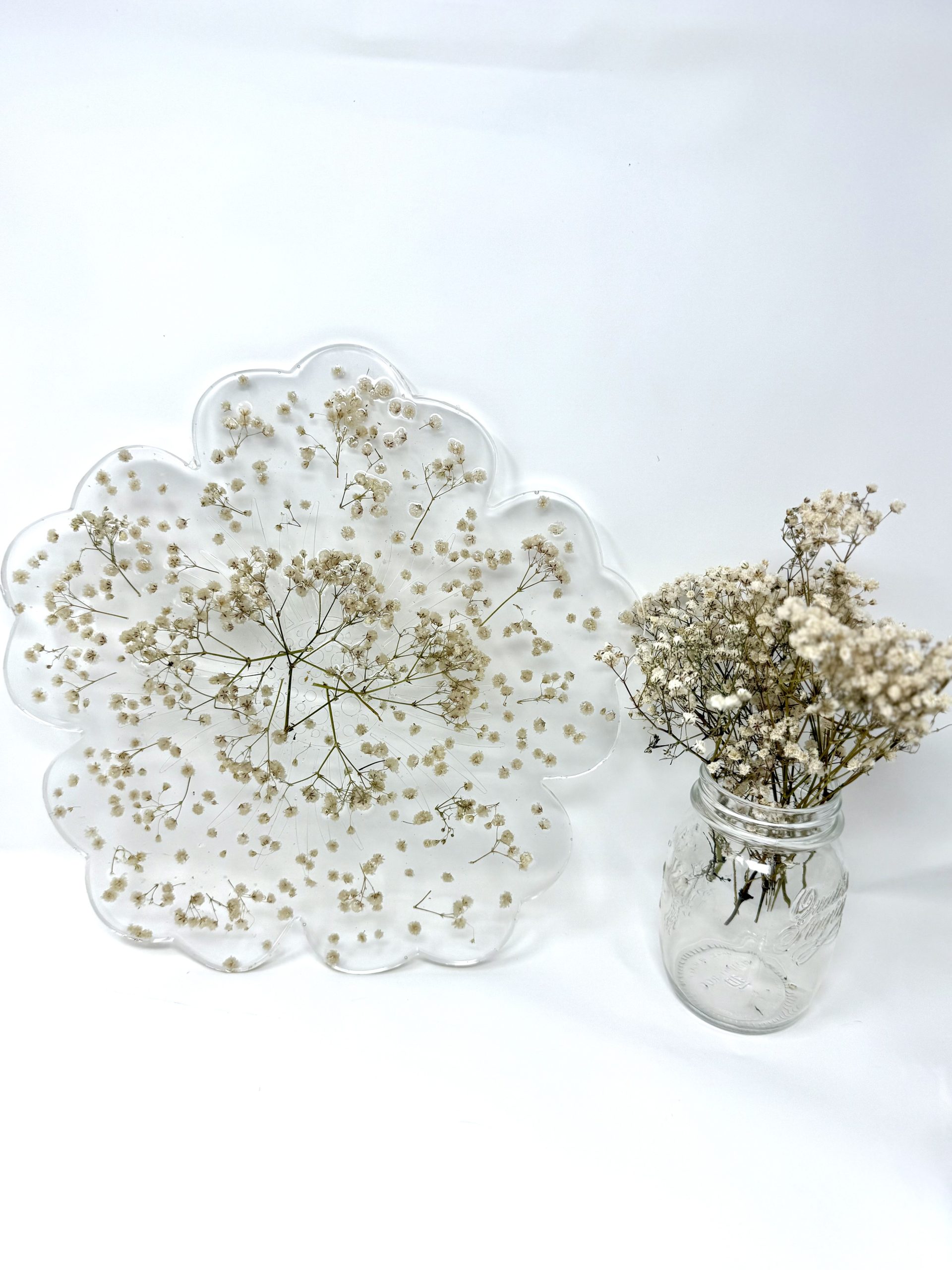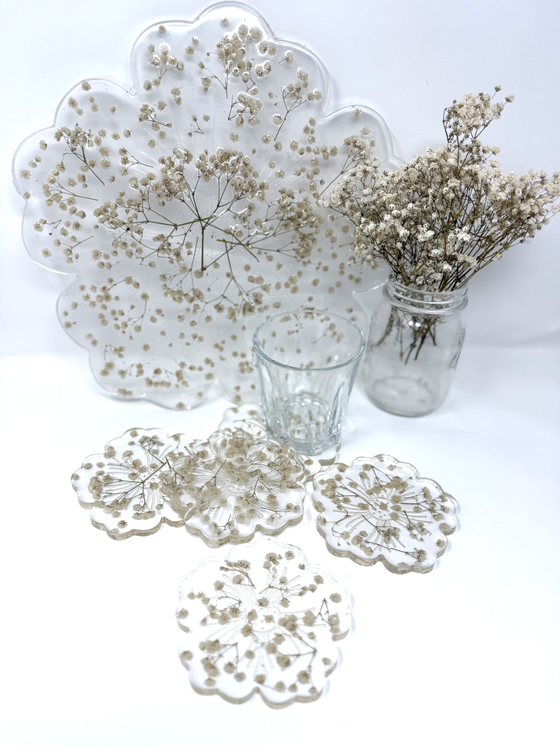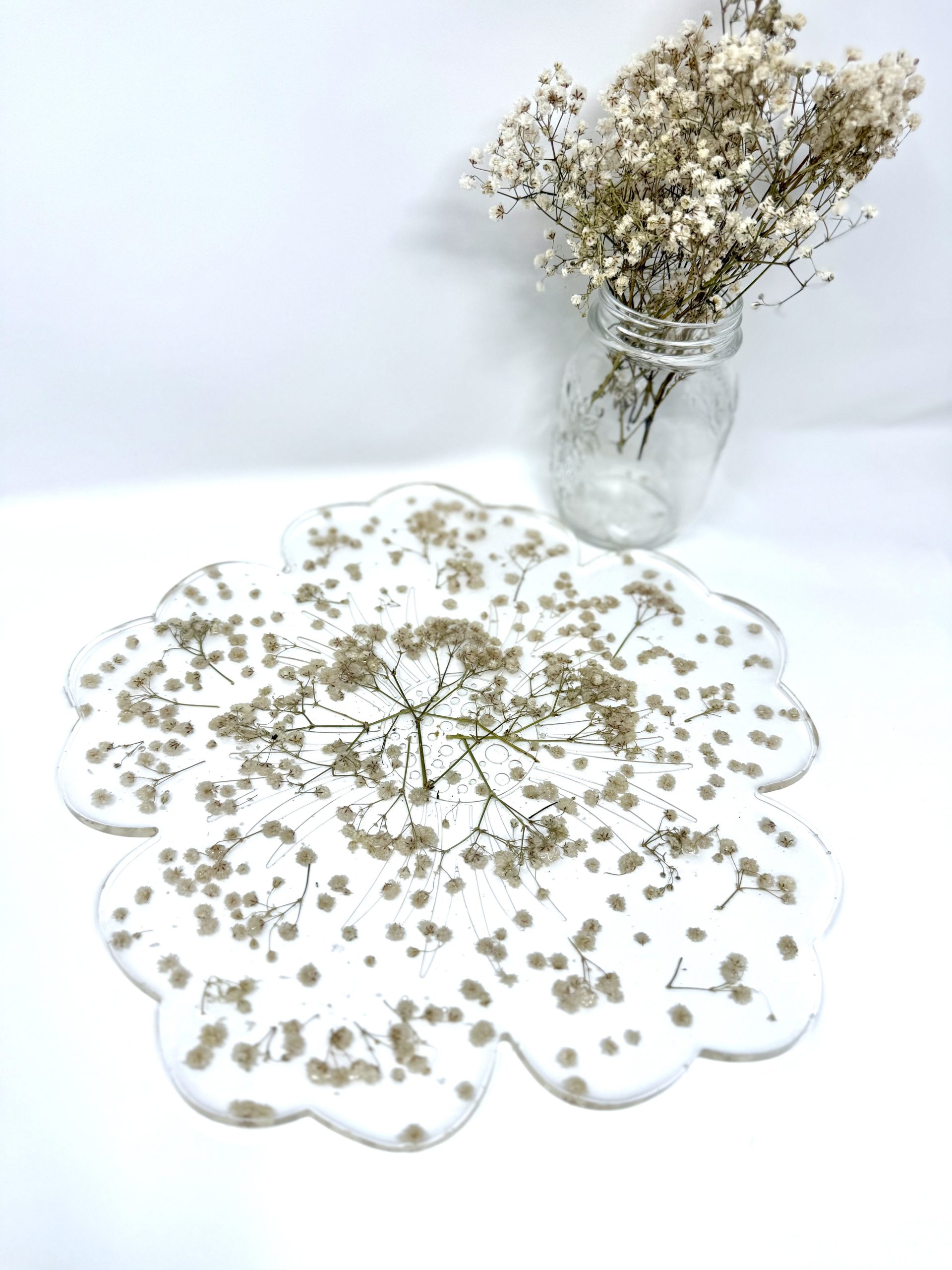 Delicate and timeless, this handmade resin set captures the beauty of baby’s breath flowers, preserved to last forever. Featuring a stunning scalloped-edge placemat and matching coasters, each piece showcases the soft, airy charm of nature in crystal-clear resin. Perfect for dining tables, coffee tables, or special gatherings, this set blends durability with artistry—bringing grace and natural beauty into your home.