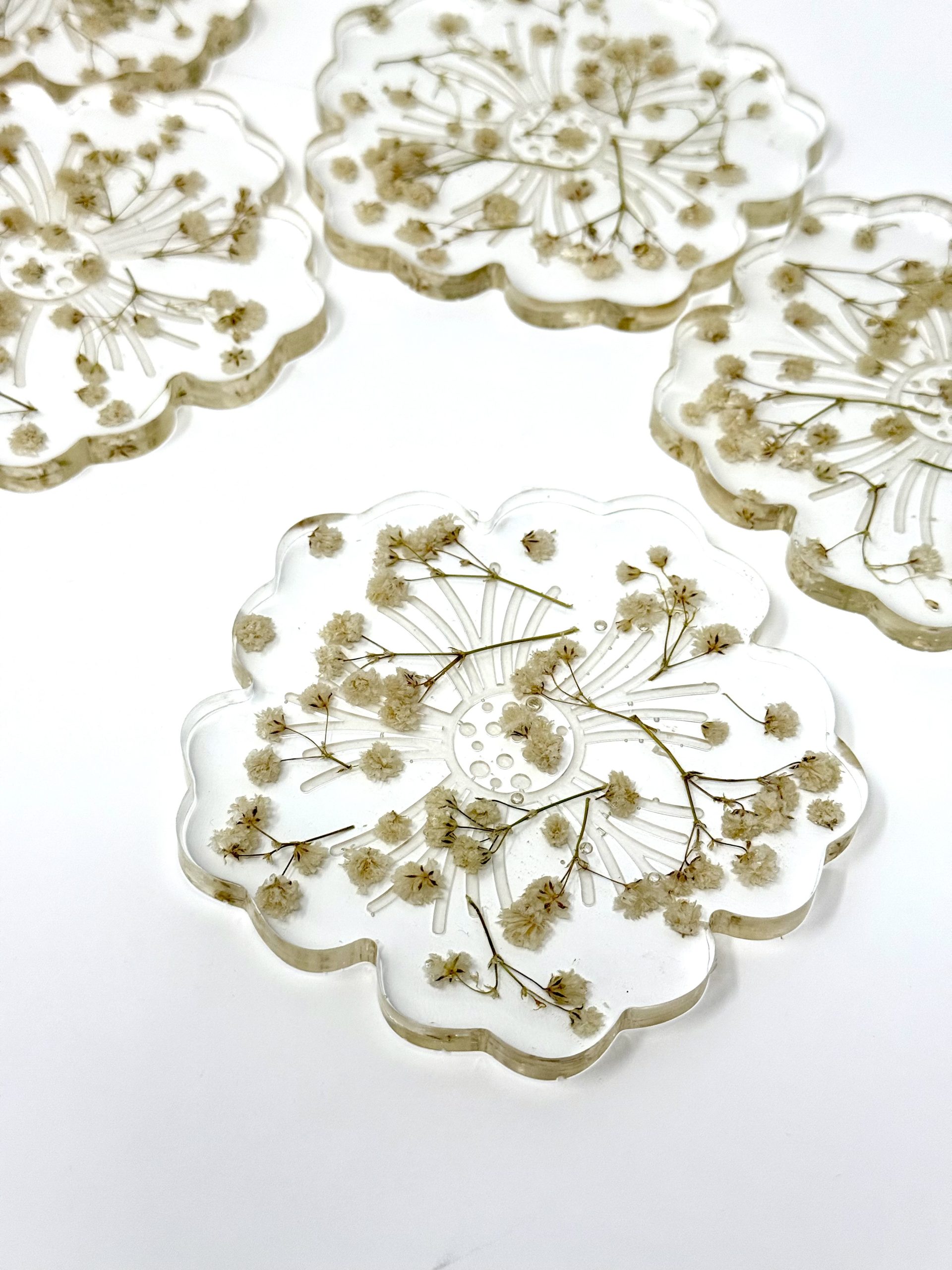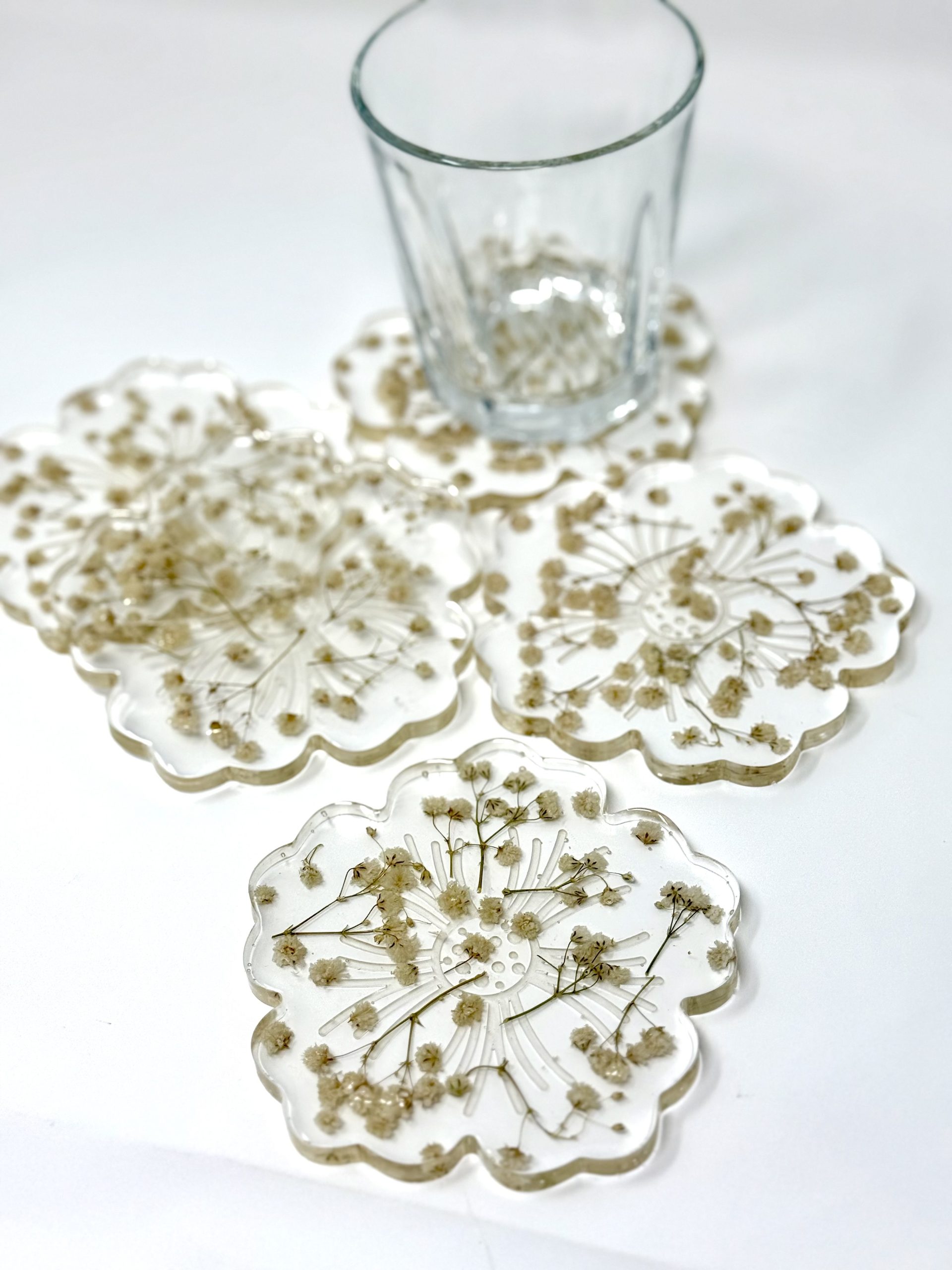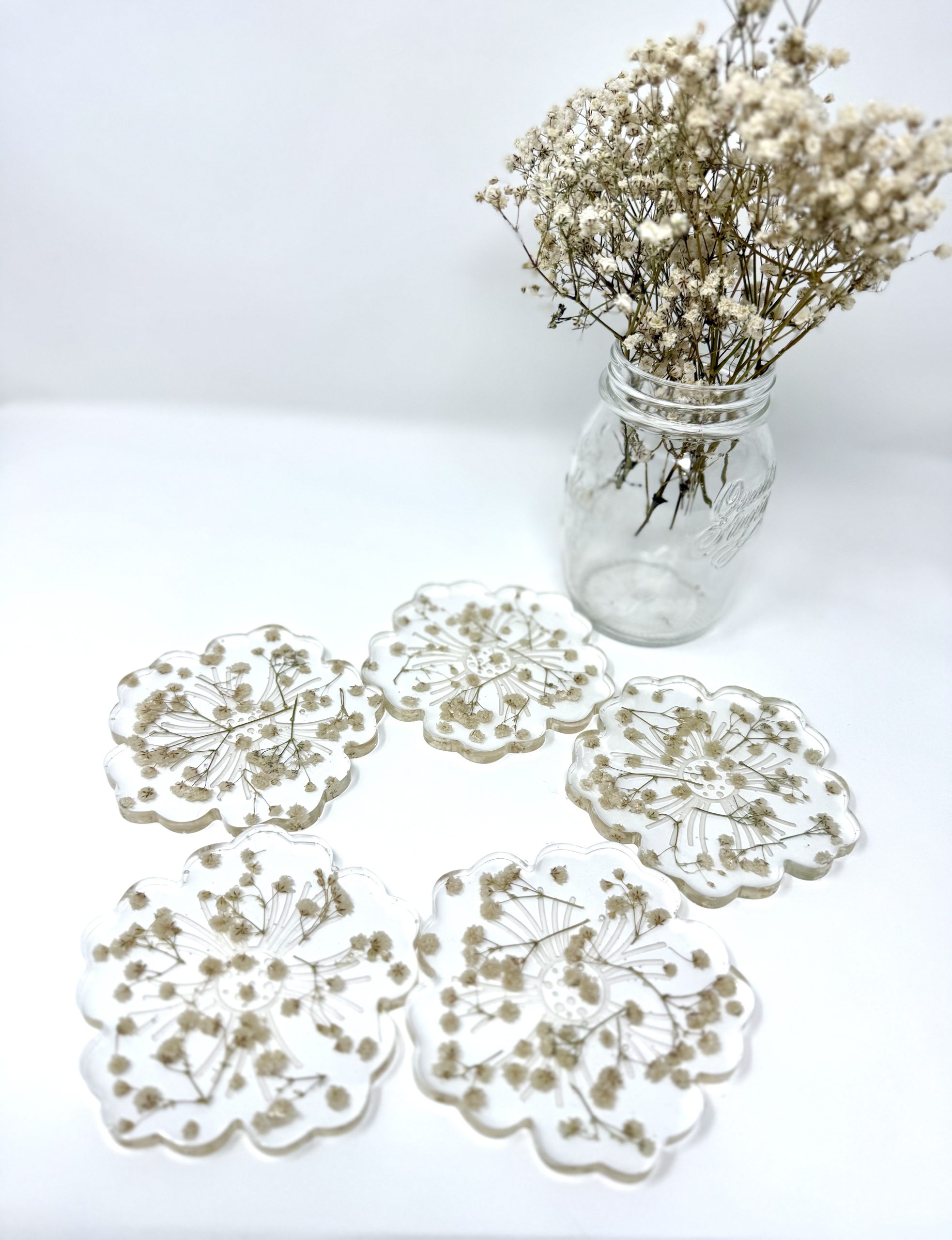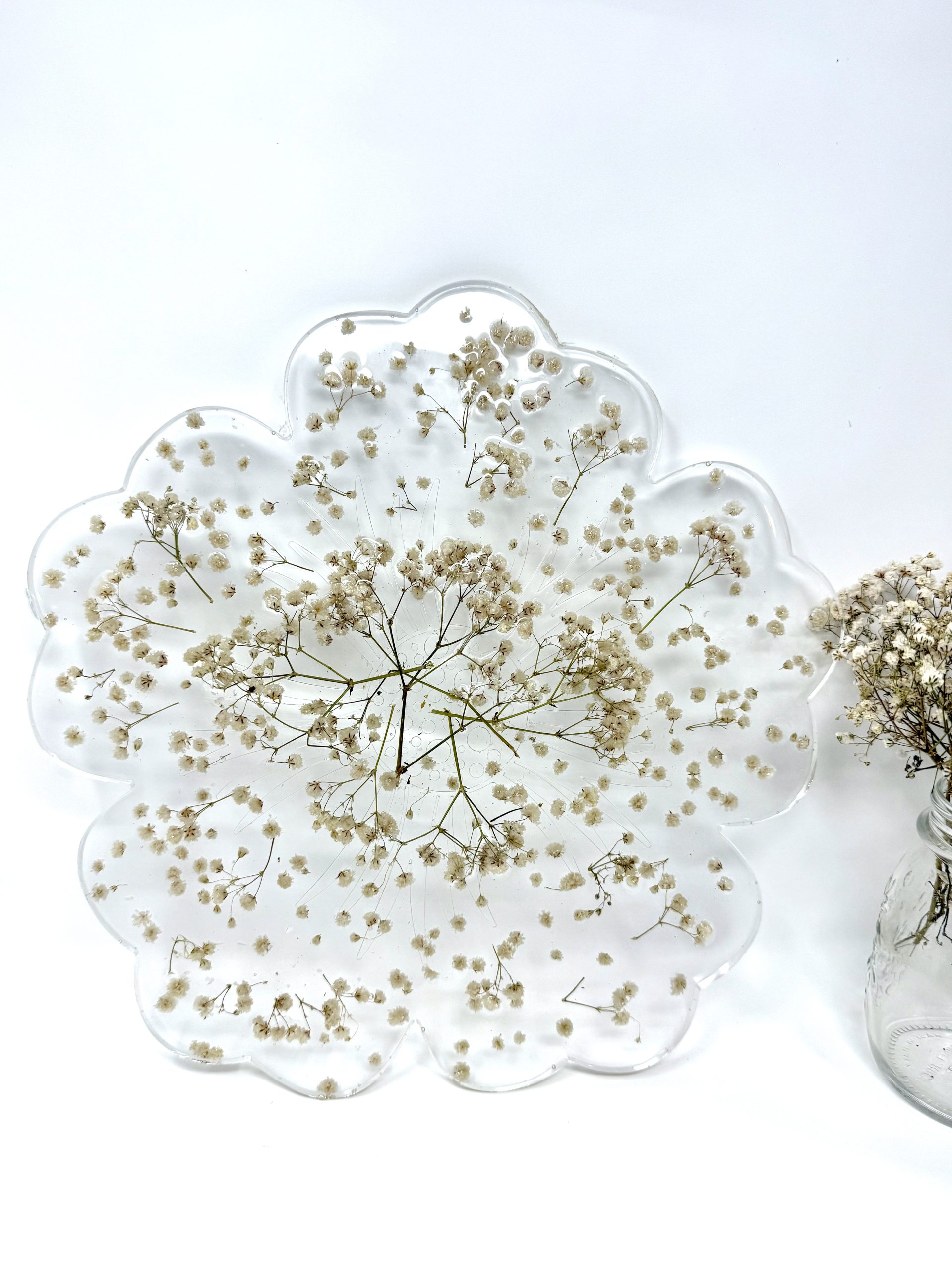 Delicate and timeless, this handmade resin set captures the beauty of baby’s breath flowers, preserved to last forever. Featuring a stunning scalloped-edge placemat and matching coasters, each piece showcases the soft, airy charm of nature in crystal-clear resin. Perfect for dining tables, coffee tables, or special gatherings, this set blends durability with artistry—bringing grace and natural beauty into your home.
