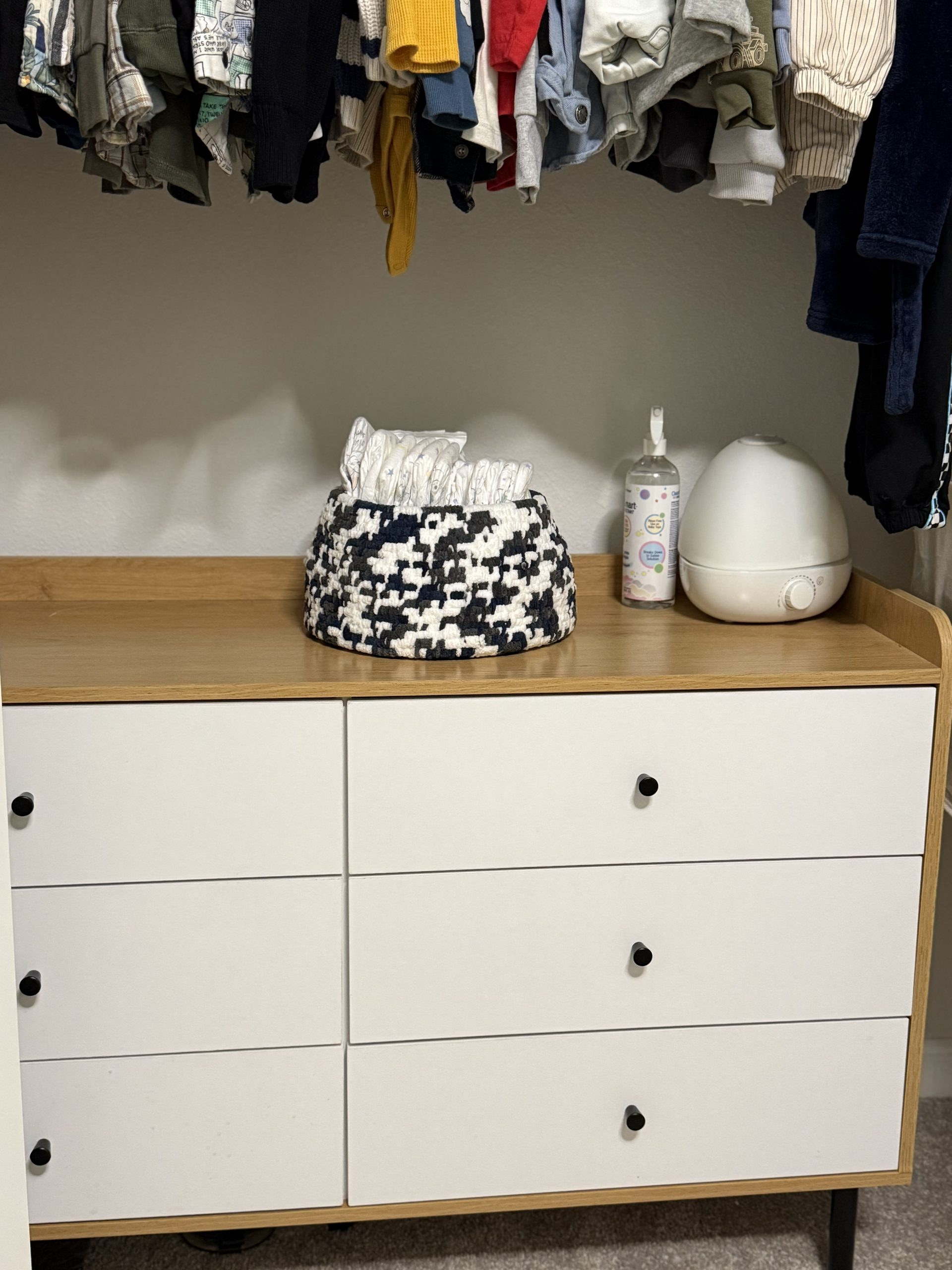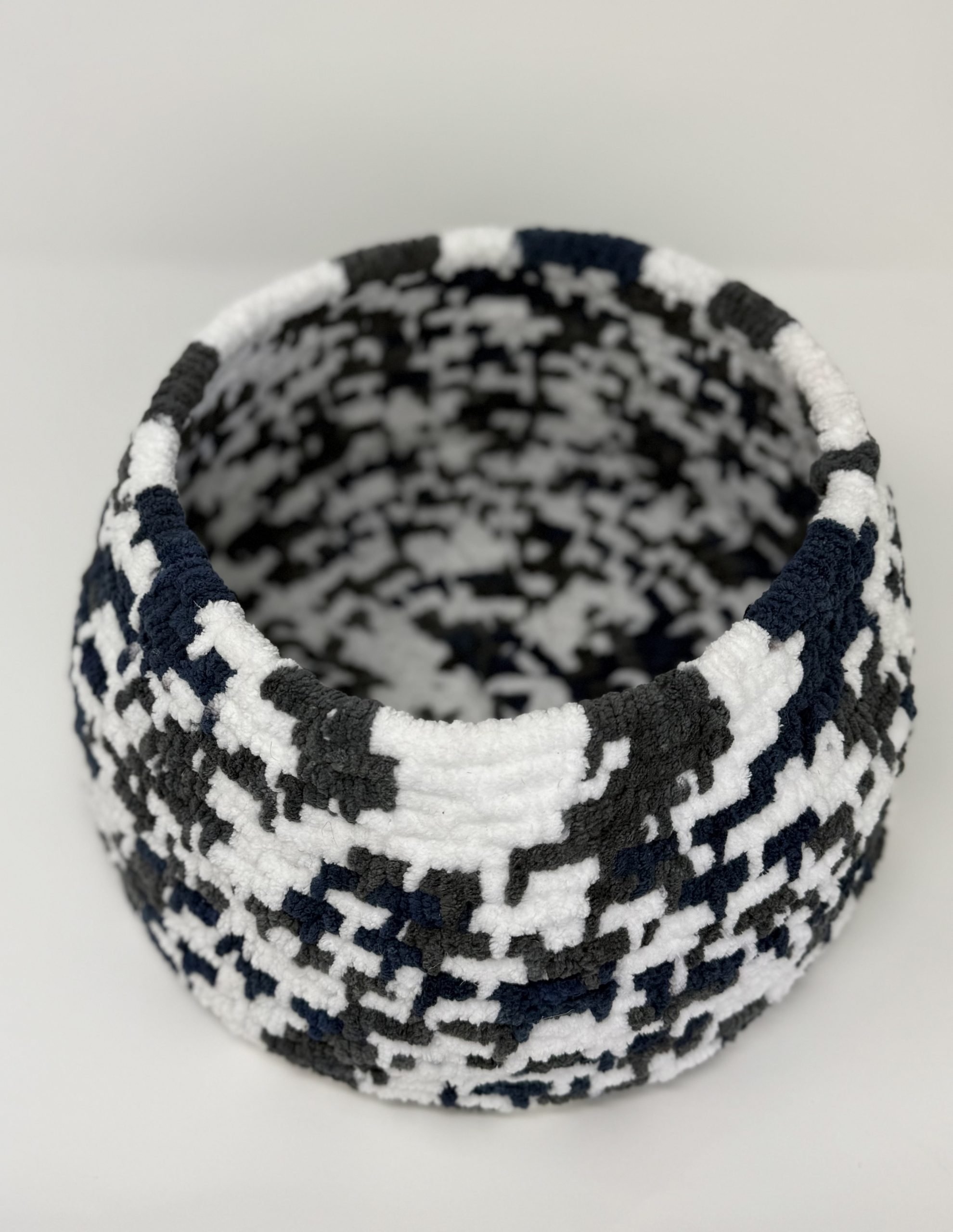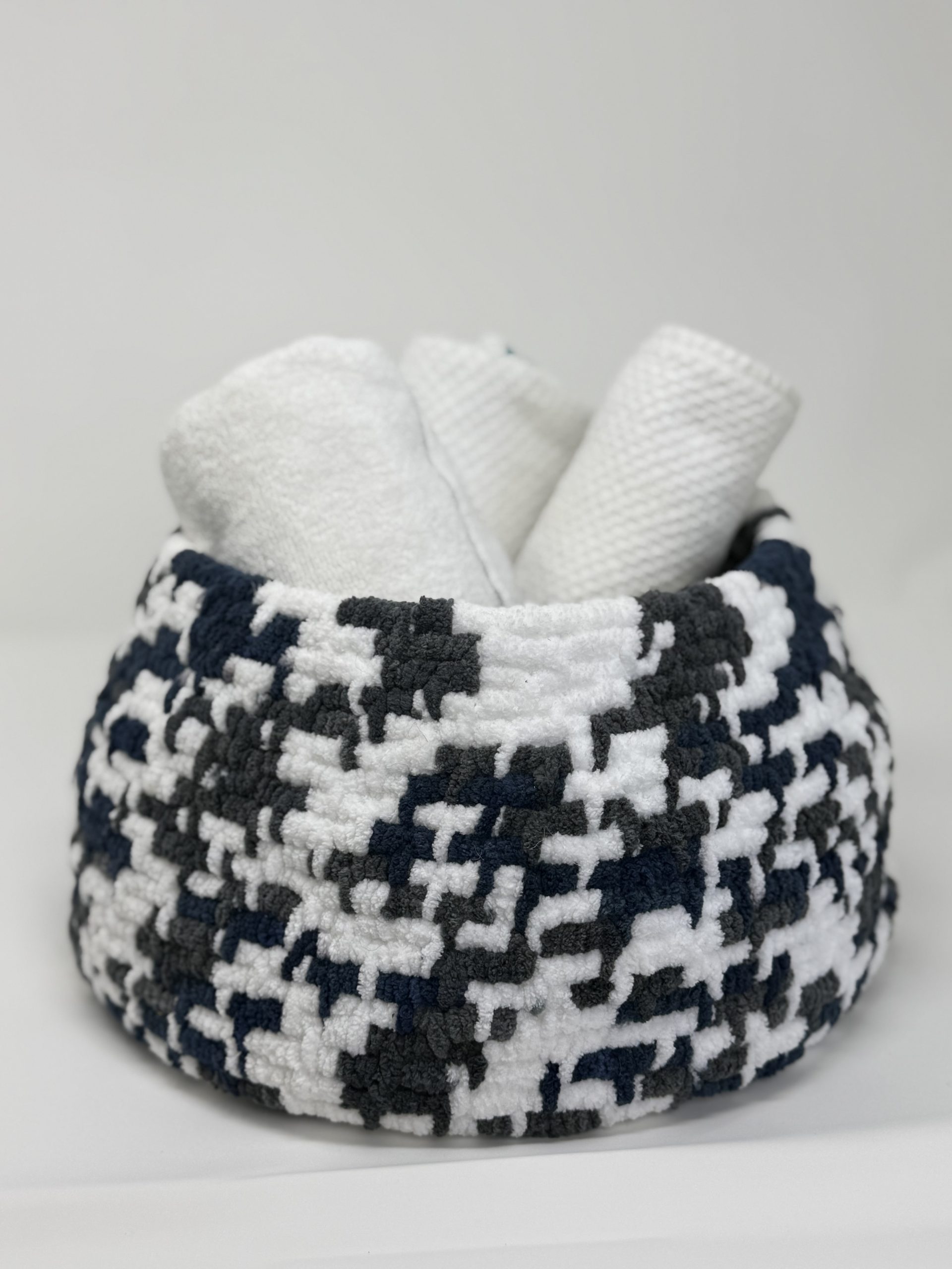 Add both comfort and style to your baby’s space with this handcrafted weaved soft basket. Made with ultra-soft, plush yarn, its modern navy blue, white, and gray pattern brings a bold yet cozy touch to a baby’s room. Sturdy and spacious, this basket is perfect for holding small baby towels & blankets,  toys, or everyday baby items, while doubling as a stylish décor accent.